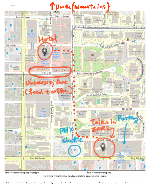 The meeting space is in othe Environment and Natural Resources 2 (ENR2) Building on the main campus of the University of Arizona (UA). Look for Room N120 on the ground floor. The nearest parking structure is the Sixth Street Garage; the ENR2 building is adjacent and to the west of the garage. Below is a map of the area; click for larger version. See also walking directions from the hotel to the lecture hall.Visitors flying to Tucson can use either Tucson International Airport (TUS) or Phoenix Sky Harbor Airport (PHX). Note flights are sometimes significantly cheaper to PHX than to TUS. From PHX, Groome Transportation runs a shuttle directly to the ENR2 building where the workshop will be held (use the "University" stop). The conference hotel is a short walk away.